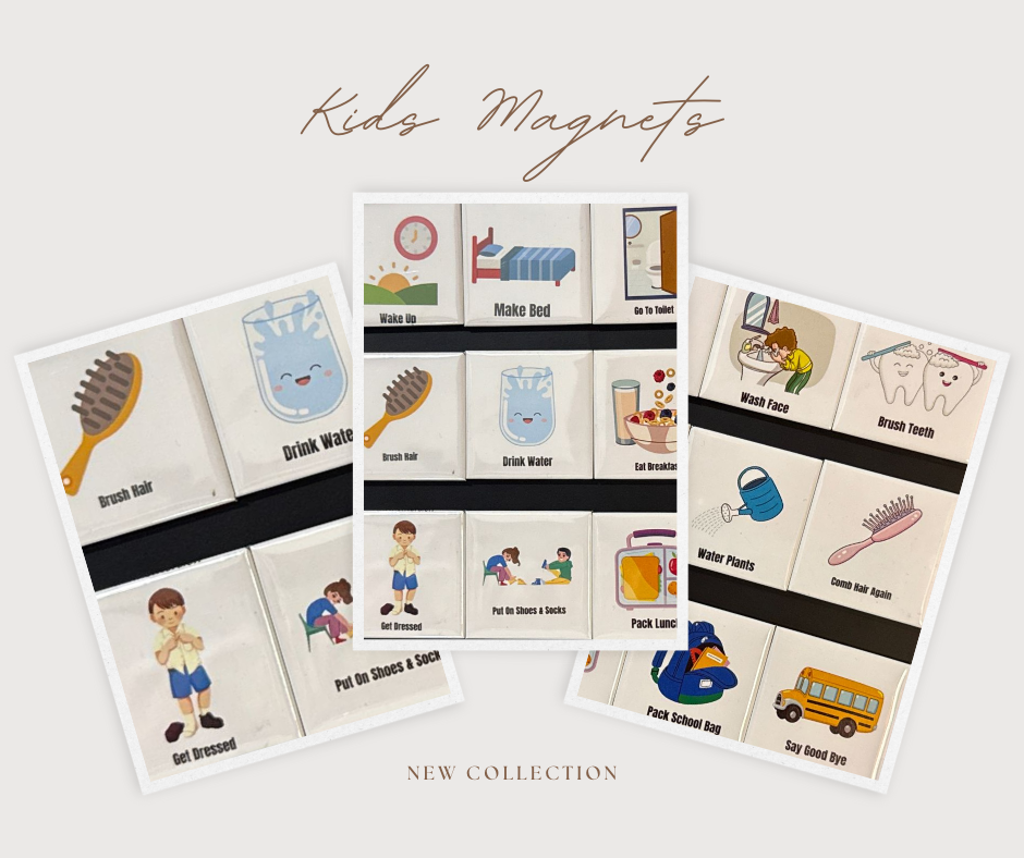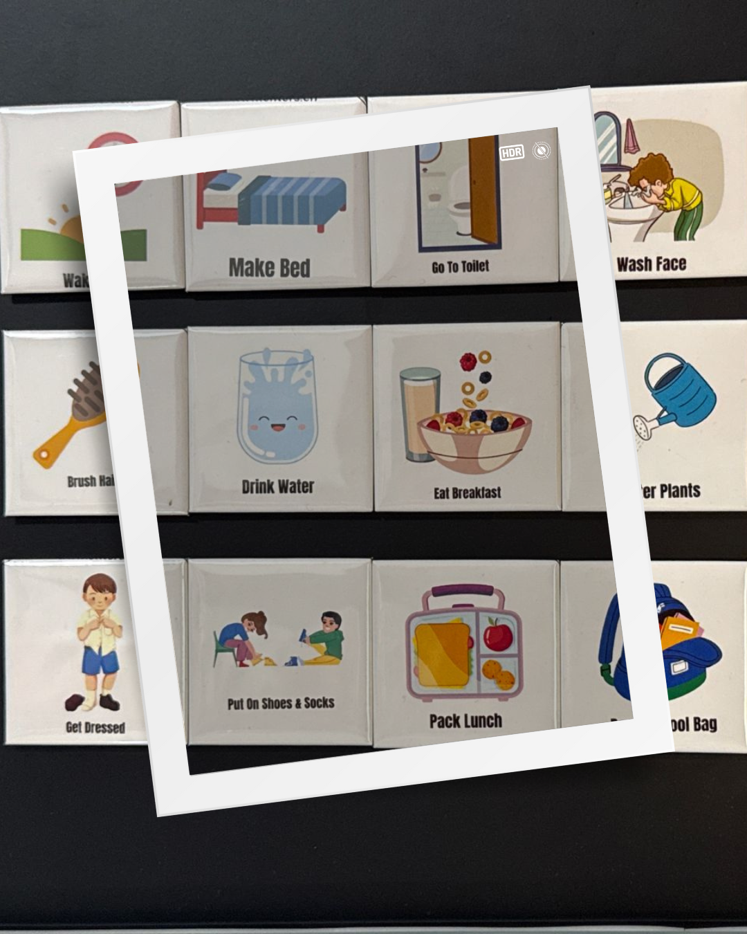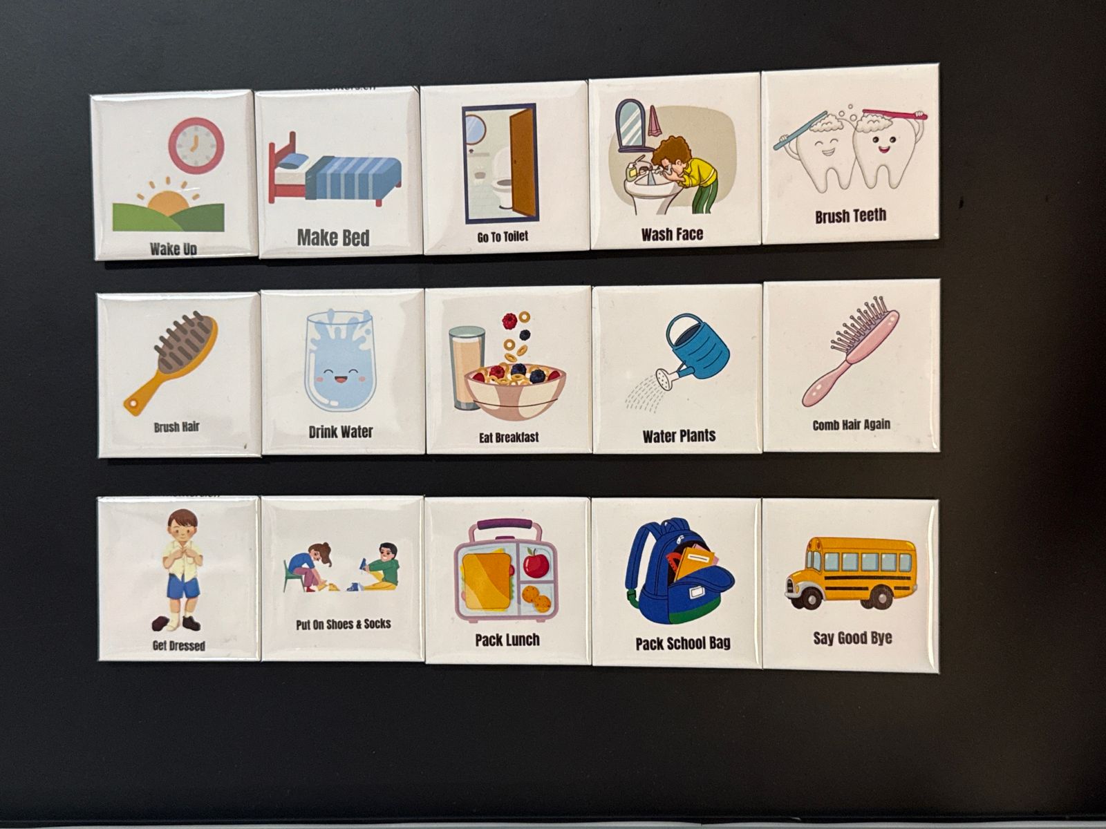 Turn busy mornings into fun and organized moments! These magnets help children plan their day step by step — from waking up, brushing their teeth, and changing into their uniform, to eating breakfast, packing their lunch, and saying goodbye.